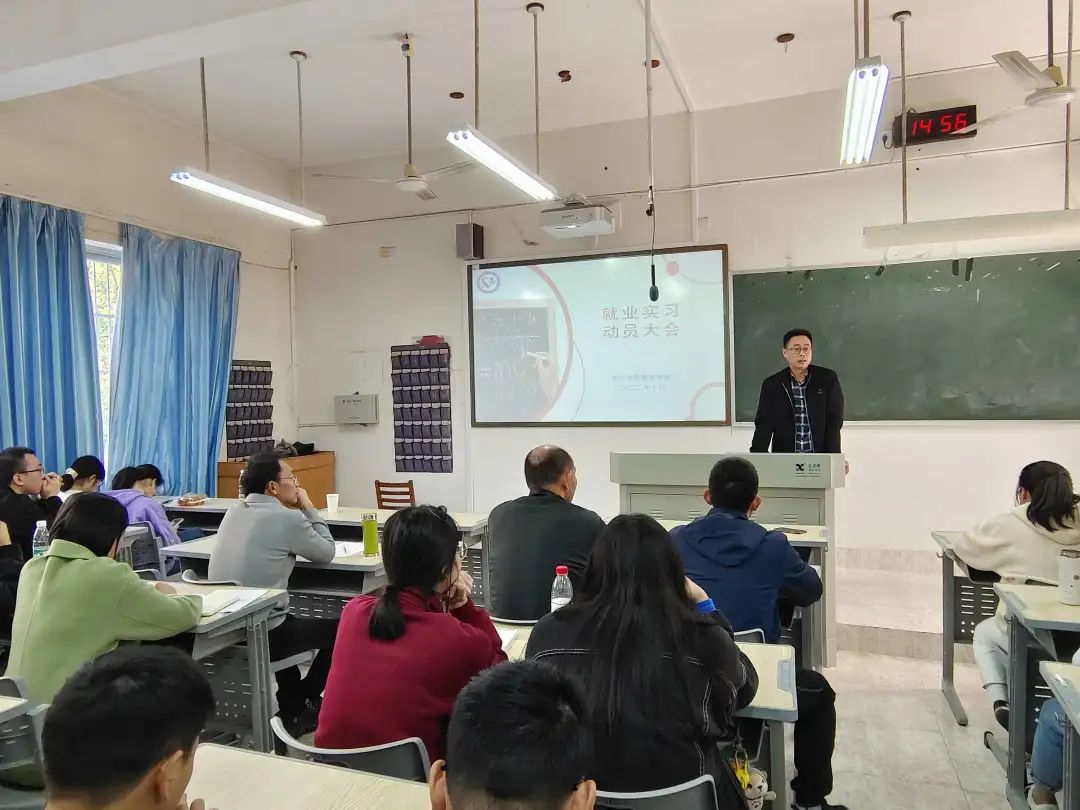 在致远楼2304召开2023届毕业生就业、实习动员大会,数学与应用数学专业19届优秀毕业生邹雨晴应邀参加;学院党总支书记谭义红、党总支副书记周新华、副院长张作政出席;专业教师陈翰麟、蔡松平、毕业班辅导员及全体2023届毕业生参加了此次大会。