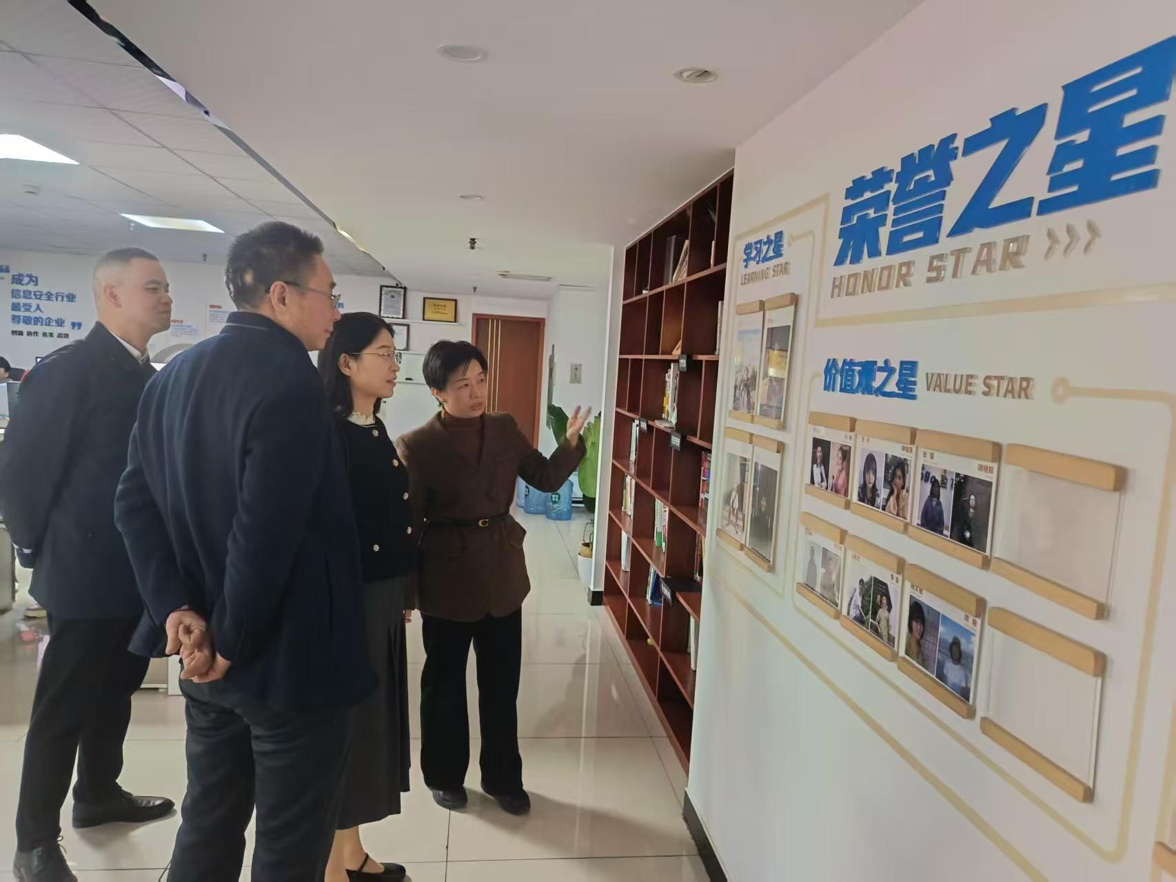在公司负责人的陪同下,学院一行实地参观了企业技术研发中心、产品展示区、办公区及荣誉展示墙:现场观摩网络安全防护系统模拟运行,技术人员同步讲解了系统如何通过数理模型实现风险预判,让大家深入了解算法逻辑、数据加密等技术,直观感受数智安全领域在金融、工业等场景的应用需求;驻足荣誉展示墙前,企业负责人介绍了公司从初创到成为行业标杆的发展历程,一张张资质证书与项目奖状,让大家切实感受到企业深厚的技术积淀与良好的行业口碑。