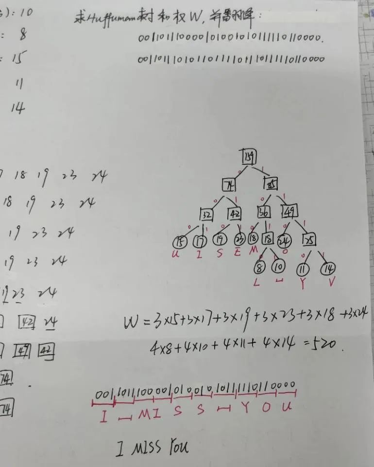 说实话,我对数学的兴趣不如我对生物学的兴趣,然而在我接触到大学数学后,我发觉数学似乎并非那般枯燥无味,它也可以很浪漫。记得在上离散数学这门课时,我学到了Huffman Tree,在了解它的计算后,有一天突发奇想的利用它创作了“I MISS YOU”的计算。那时候自己偷偷窃喜了好久,但我没好意思去找老师求证,怕他认为我心术不正。整个过程中我发现自己是快乐的,在每一步的设计中都透露着我对知识的掌握和运用。